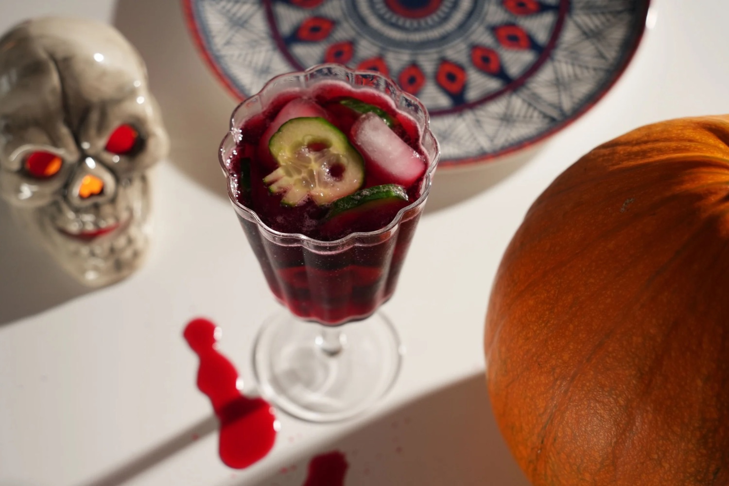 Take a moment to appreciate those deep red hues, the floating cucumber skulls, and all the fizz. This Halloween tea recipe is a spooky, playful Halloween Chapman that’s almost too pretty to sip… almost.